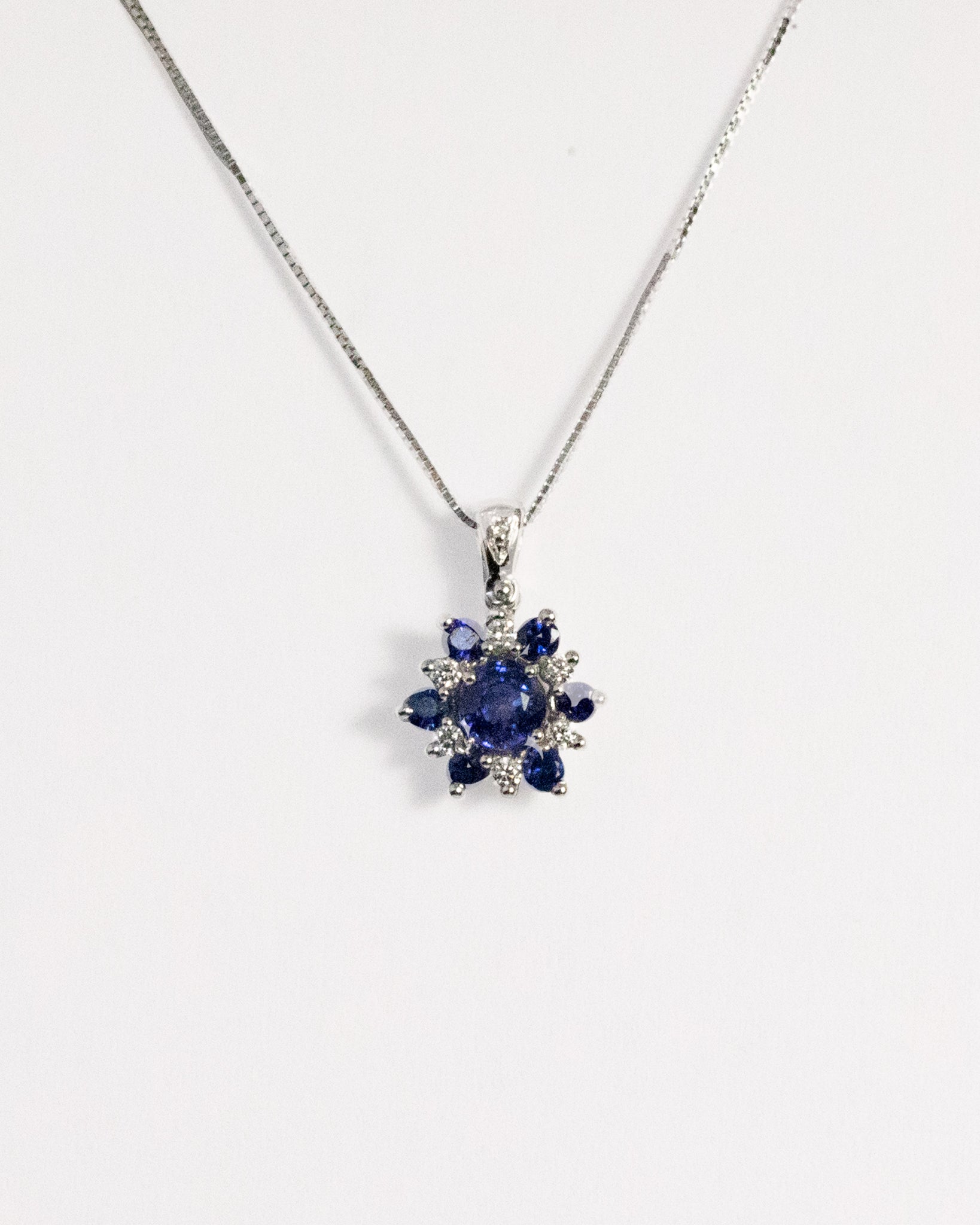 18ct. White gold, sapphire and diamond set cluster pendant with a diamond set bail.